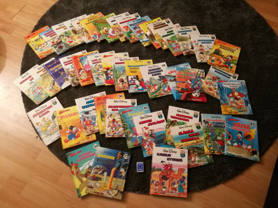 mikki hiiren kuuraketti nro31 v.1955 (kunto h/t), hinnat näille kultaisille 10-20e/kpl..tai tarjous aku ankan taskukirja nro 6 : aku baba ja viisi rosvoa v.1970 (ensimmäinen painos, kunto hyvän/tyydyttävän luokkaa?)H.30e..saa tarjotakkin 80-luvulta: walt disney ankkalinnan tarinoita 1-3 v.1981 (uutena ostettu ja laitettu samantien talteen), ankkalinnan tarinoita 5-7 v.1983 (uutena ost. ei ole luettu vaan laatikoitu) nämä ankkalinnan tarinat yhteensä 30e (näissä on noin 24 kaksipuoleista sivua per kirja. ensimmäisiä numeroita ja 1. painoksia) sport goofy tammen hopeiset kirjat (ei luettu) 2.painos v.1975-78 minikirjat: mustan pekan rakettilento v.1972, mikki ja dumbo v.1967, aku ankka hypnoosissa v.1969 (nämä kolme yht.15e)