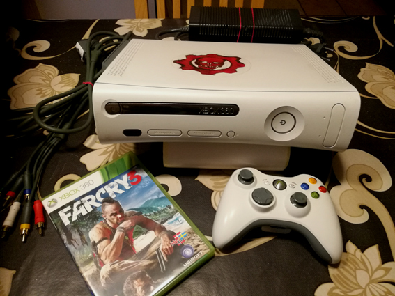 Xbox 360 org. johdoilla (ei mukana hdmi piuhaa, jolla kuvan laatu olisi terävämpi) + Far cry 3 peli H.60e (kuvan tavarat) Pelikortit -80-luvulta :